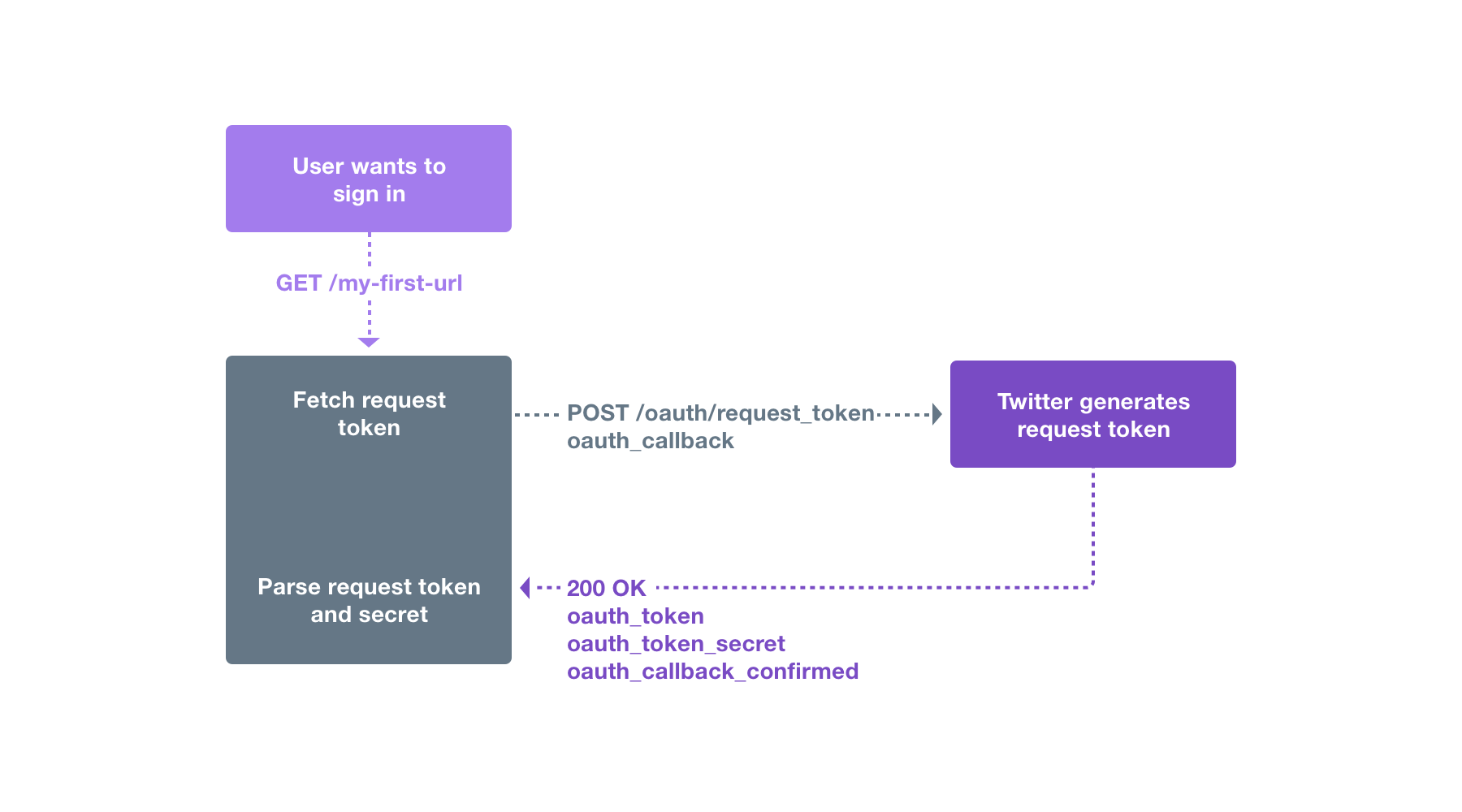To start a sign-in flow, your X app must obtain a request token by sending a signed message to POST oauth/request_token. The only unique parameter in this request is oauth_callback, which must be a URL-encoded version of the URL you wish your user to be redirected to when they complete step 2. The remaining parameters are added by the OAuth signing process.Note: Any callback URL that you use with the POST oauth/request_token endpoint will have to be registered within the X app settings in the Developer Console.