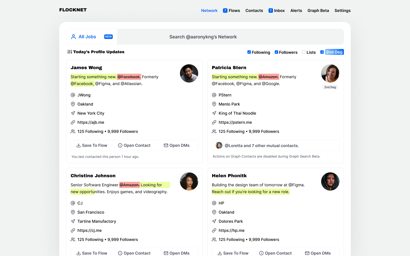 Here’s the tl;drHere’s how Aaron Ng—developer and creator— was able to use X’s API to build Flocknet, a search engine for your X network. People are using Flocknet to expand their networks, recruit talent, and source investment leads. Initially built for his own personal use, Flocknet is now helping people manage millions of contacts on X.